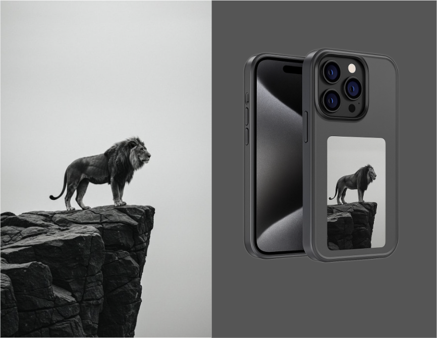 Plongez dans l’univers de la personnalisation intelligente. Grâce à notre système NFC innovant, vous pouvez transférer vos visuels favoris directement sur l’écran E-Ink de votre coque, en toute simplicité.
